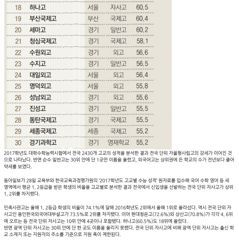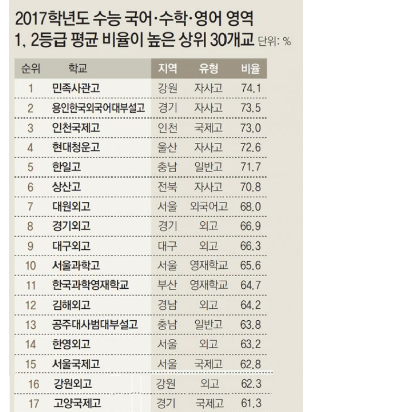 The result of 2017 College Scholastic Ability Test analysis involving 2,430 of high schools across the nation proves that autonomous private high schools outperformed their general high school counterparts, placing them in the top-tier of the overall 30, whereas only one general high school ranked in the top 30.