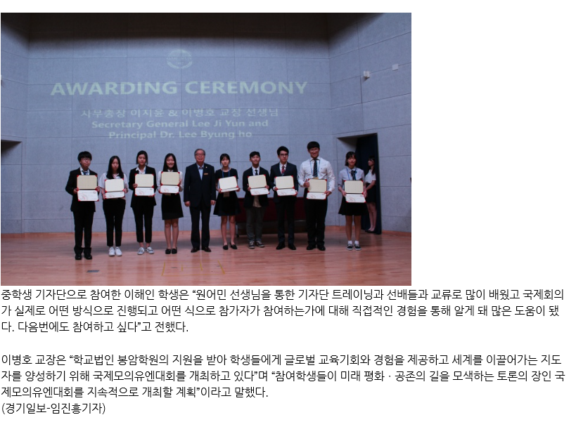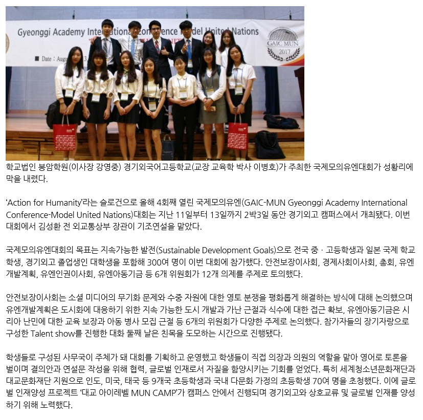 GAIC MUN (Gyeonggi Academy International Conference Model United Nations) hosted by Gyeonggi Academy of Foreign Languages (Principal Lee, Byong-Ho, Ph.D.) ended with a great success.